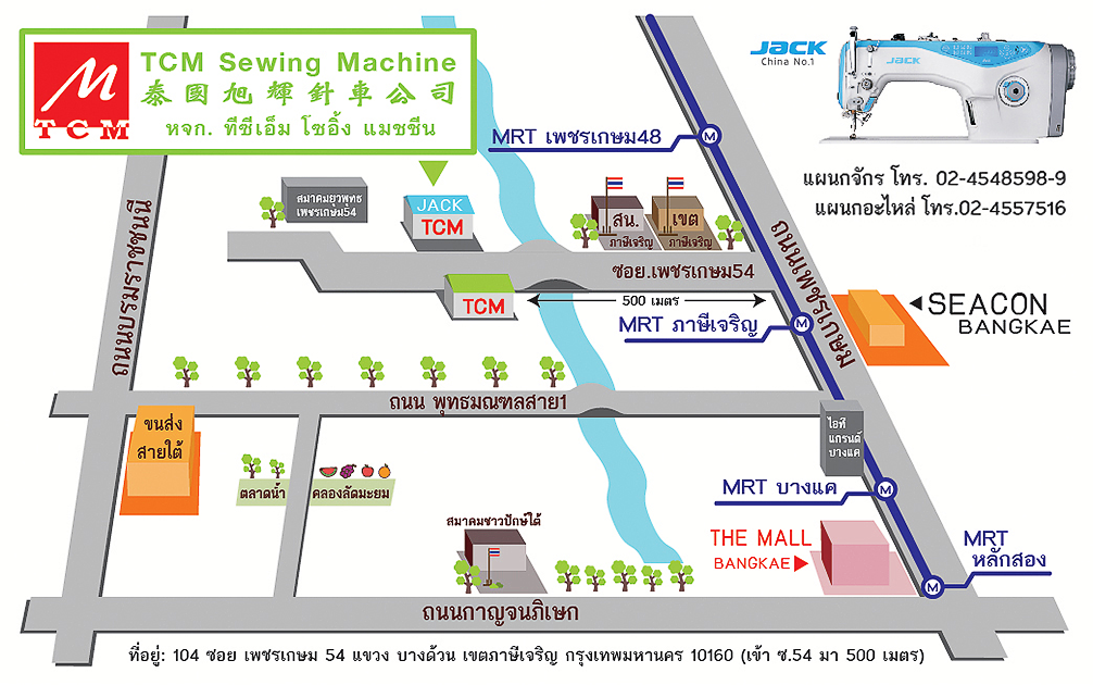 TCM SEWING MACHINE เปิดกิจการตั้งแต่ปี 2545 ดำเนินธุรกิจ นำเข้าจักรเย็บผ้า จักรเย็บอุตสาหกรรม แบรนด์ดังระดับโลกทุกชนิด เป็นตัวแทนจำหน่ายจักรเย็บอุตสาหกรรม JACK แต่เพียงผู้เดียวในประเทศไทย ที่มียอดขายอันดับ 1 ทั่วโลก 14 ปีซ้อน