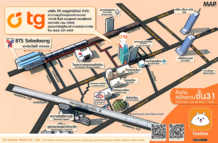 1.สมัครด้วยตนเองได้ทุกวันจันทร์ - ศุกร์ เวลา 09.00 - 17.00 น. ที่ บริษัท ทีจี เซลลูล่าร์เวิลด์ จำกัด อาคารสกุลไทยสุรวงศ์ทาวเวอร์ ชั้น 31 ถนนสุรวงศ์ แขวงสุริยวงศ์ เขตบางรัก กรุงเทพฯ 10500